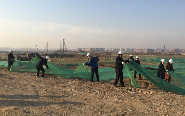 工地裸露地块面积大,引起的6扬尘对周边空气环境有很大的影响,为了周边居民及新校区广大师生能呼吸到自然清新的空气,使空气质量达到环保标准,早上八点半,党员们纷纷扛着铁锹,拿着扫把、小铲子走进现场,清理人行道上的垃圾、平整土地,堆裸露地块进行防尘方格网覆盖。