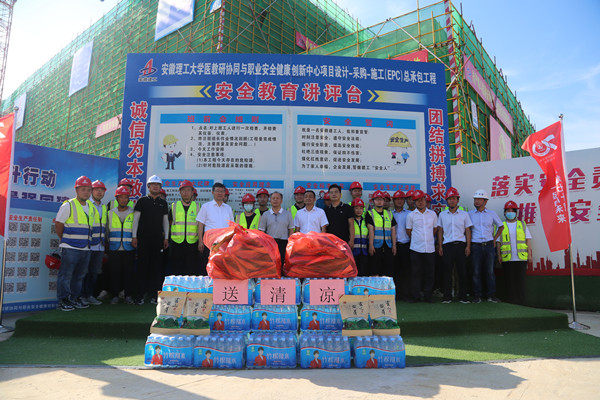 近期连日高温,学校在建项目施工坚持稳步推进。7月12日上午,在校党委书记郭永存,党委常委、纪委书记、监察专员周旭指导、陪同下,校园基本建设处党支部走进“安徽建工集团安徽理工大学在建项目社区”开展“党员进社区,慰问劳动者”活动,看望慰问高温下坚守岗位的工程建设者,并送上防暑降温用品。