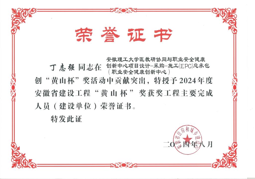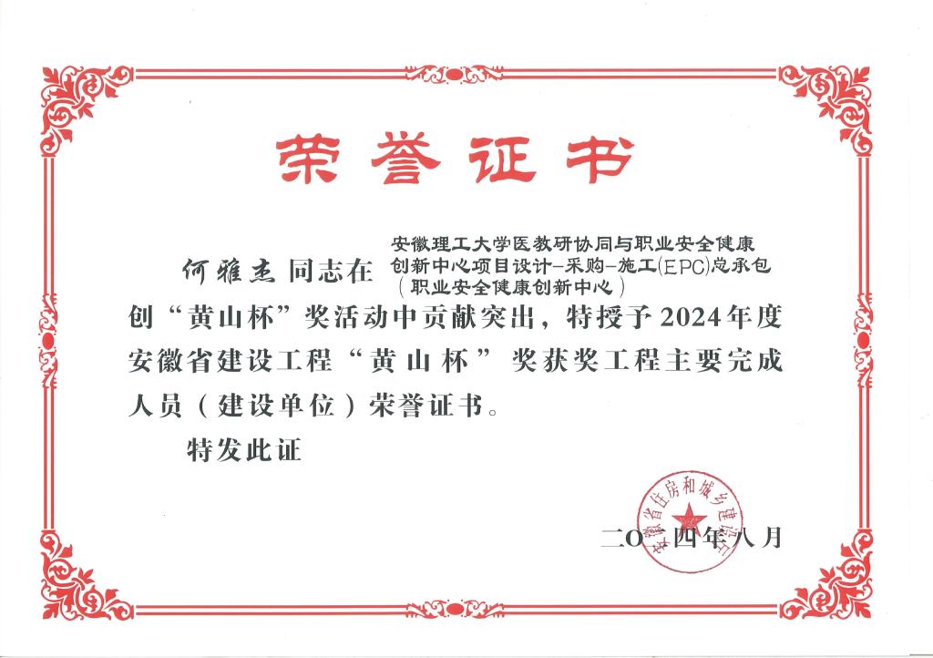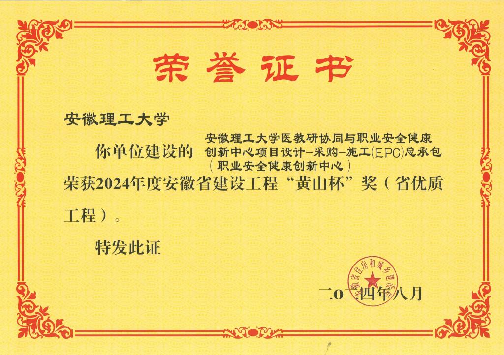 近日,继获评2023年度淮南市建设工程质量评比“舜耕杯”后,职业安全健康创新中心项目荣获2024年度安徽省建设工程最高荣誉奖“黄山杯”(省优质工程);丁志强、王正强、何雅杰作为项目主要完成人受到表彰。