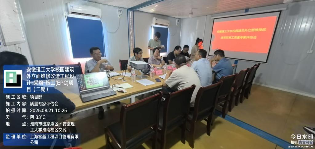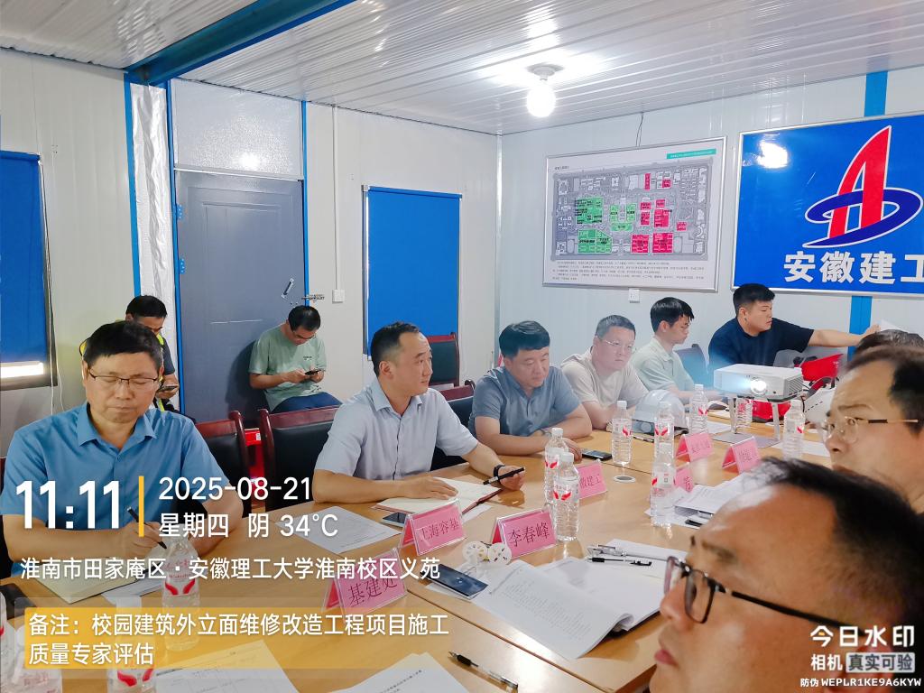 质量评估专家和校园基本建设处首先听取了总承包单位、监理单位、跟踪审计单位针对工程概况、质量管理、监理督查、过程跟踪等方面工作的汇报;查看了设计文件、施工方案、质量管理、督查督导等方面资料;随后,与会人员现场查验了实体质量并针对施工管理给予了指导意见;最后,专家组反馈了评估意见,认为“安徽理工大学校园建筑外立面维修改造项目”施工管理规范、质量可控可靠,并给出了相关完善意见。